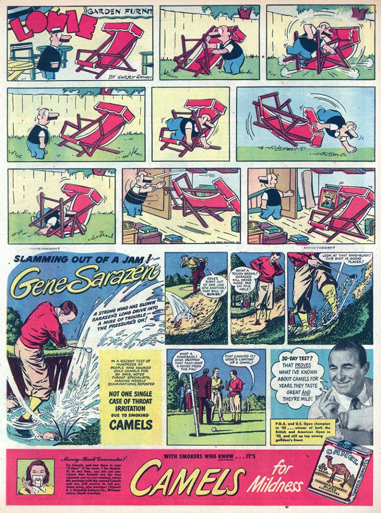 The second half of the comic section starts with a page with Roy Crane’s CAPTAIN EASY, drawn here by Walt Scott, and V.T. Hamlin’s ALLEY OOP, plus HENRY by Carl Anderson. Then it’s REX MORGAN, MD by Bradley and Edgington, BOOTS by Martin, and Merrill Blossar’s FRECKLES AND HIS FRIENDS (plus the topper strip HECTOR). Harry Hanan’s silent comic LOUIE, an ad for Camel cigarettes (I don’t think cancer sticks are advertised in the funnies anymore!), OUT OUR WAY by J.R. Williams, and OUR BOARDING HOUSE follow.