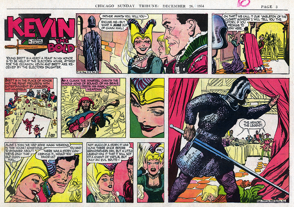 As the plot thickens, we learn that Thornberry’s vanity and jealousy is matched only by his ruthlessness. As with several other episodes from this story arc, the visual is upgraded to a crisp NEA proof—which in this case has a hole cut into it—likely the casualty a craft project undertaken by one of Kreigh Collins’ younger children or grandchildren (moi?). I guess those Times-Union halves come in handy after all.