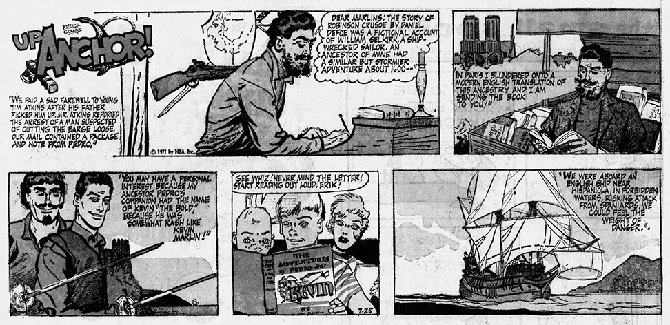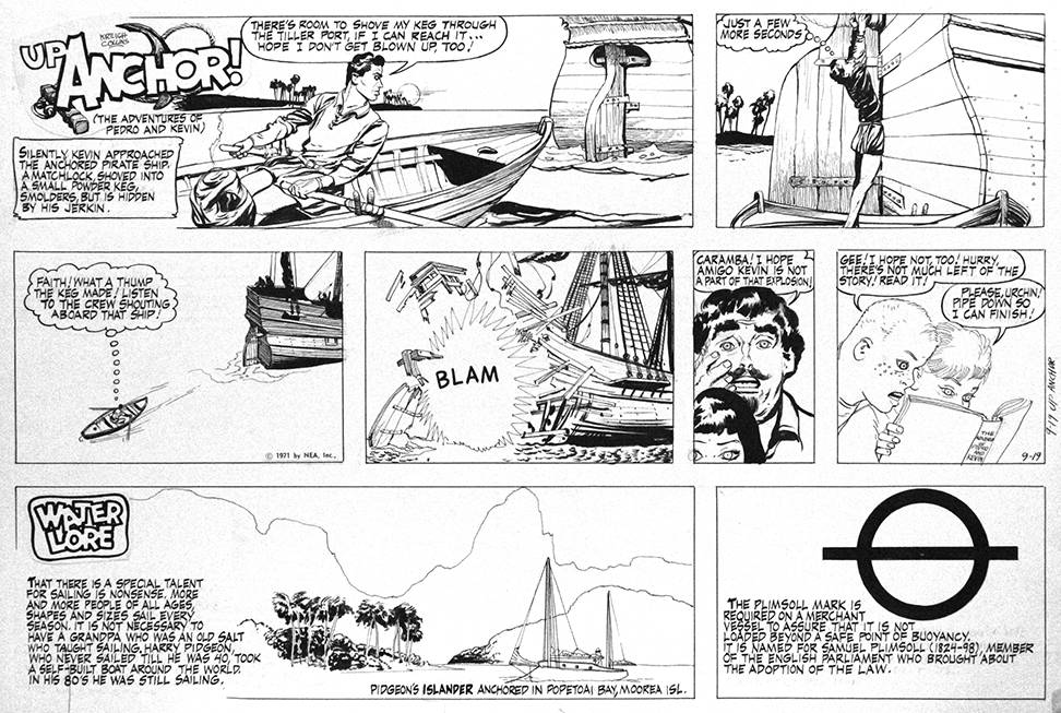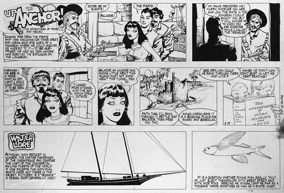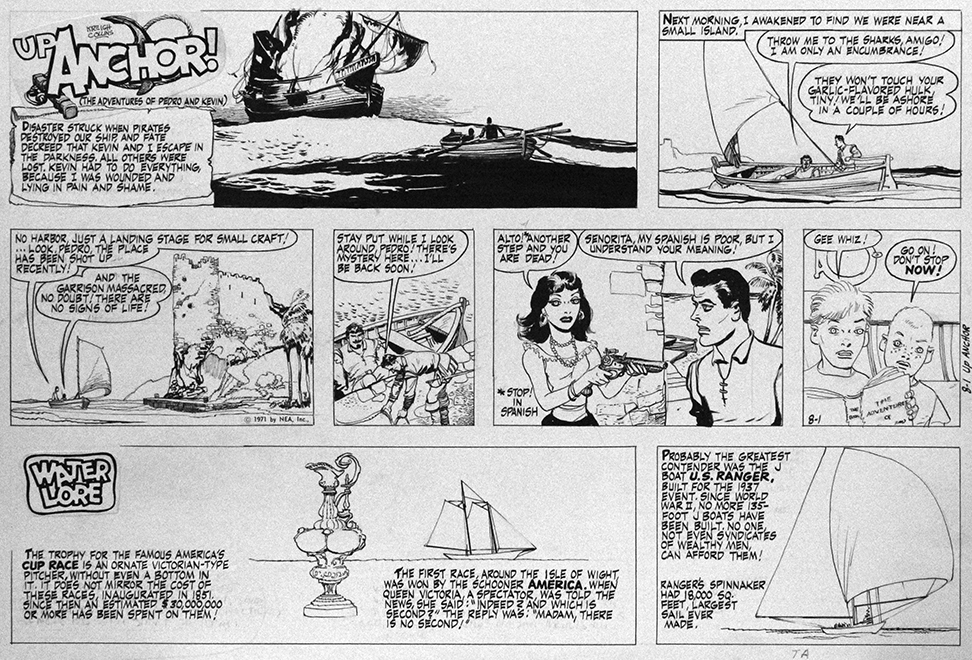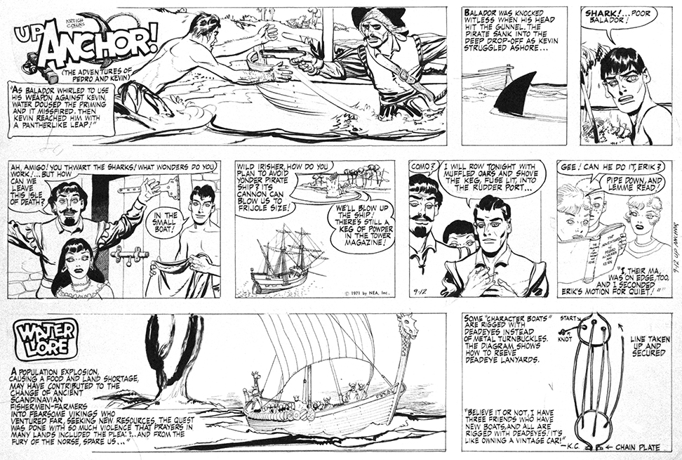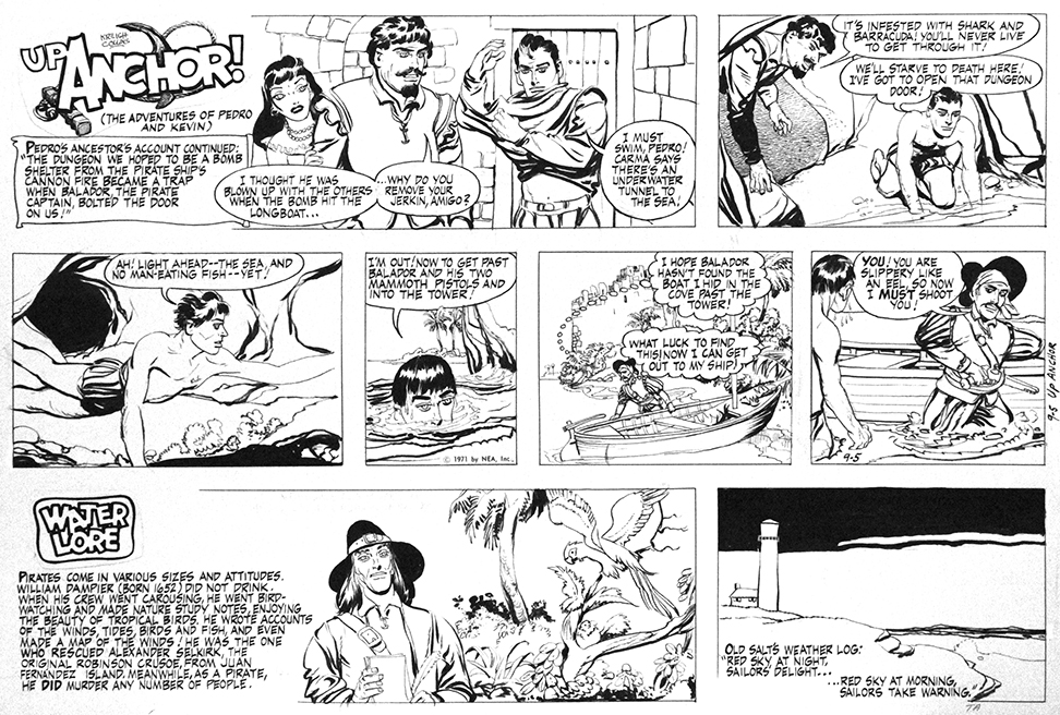 My collection of my grandfather’s comics began when I acquired two complete years of Florida Times-Union Sunday half pages (1955–56). Thanks to a leap year, there were 105 episodes in all. That bit of good news was offset slightly by the middling print quality of many of the episodes. Below, the opening splash panel shows quite nicely, but by the third panel, skin tones are represented by near-solid patches of magenta ink. Whenever possible, I will post comics from other sources.