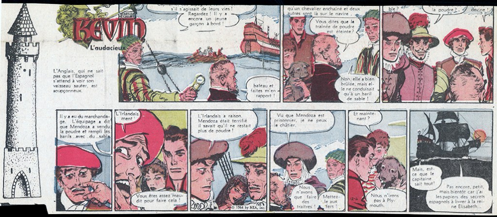 One 2009 search on abebooks turned up a hit for 37 color KEVIN L’AUDACIEUX third-pages—from a newspaper Québeçois. They weren’t expensive, so I made the purchase—my second, comics-wise. The plan was to translate them back to English, set all the type on my computer, and digitally combine everything—and plug a hole in my collection.