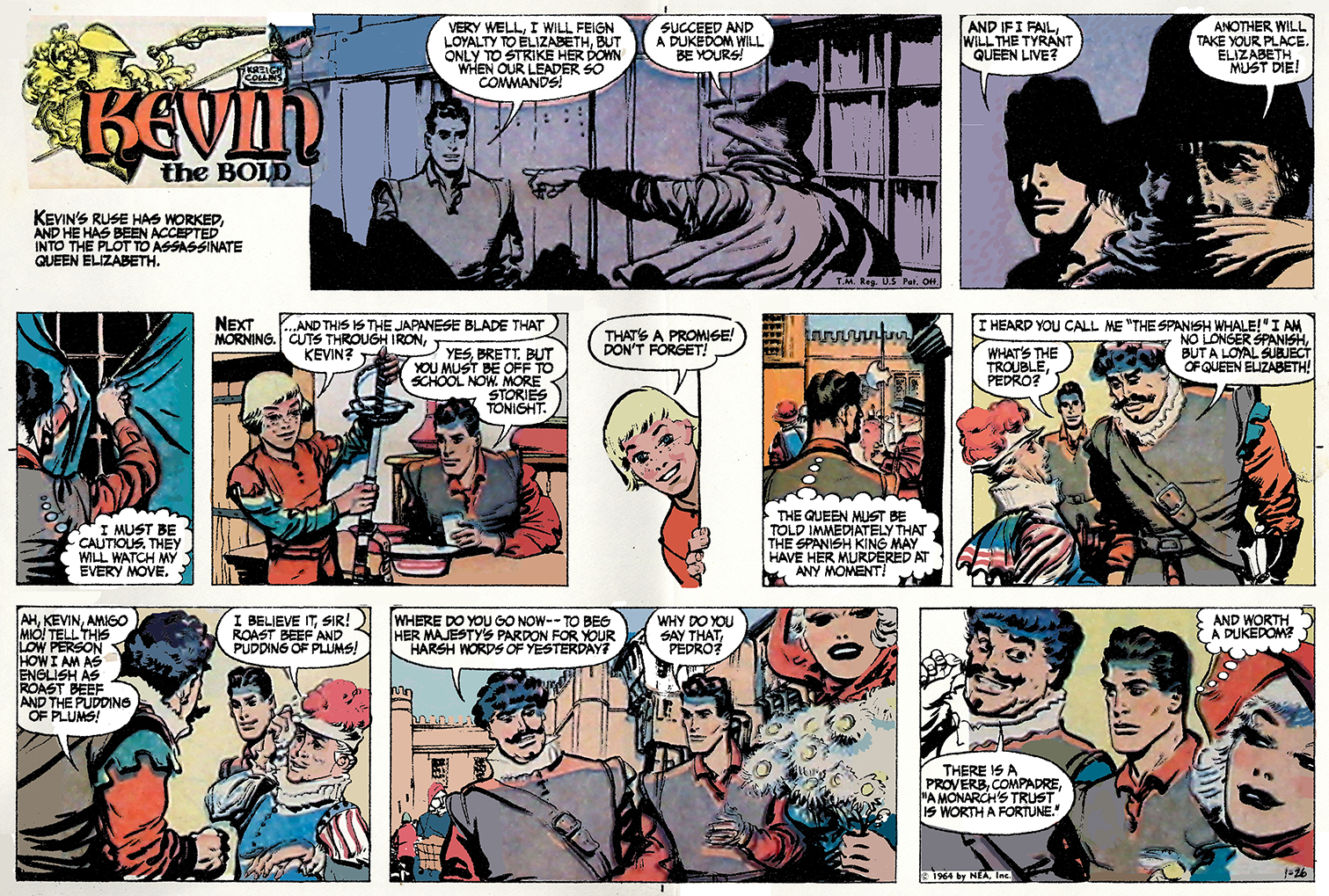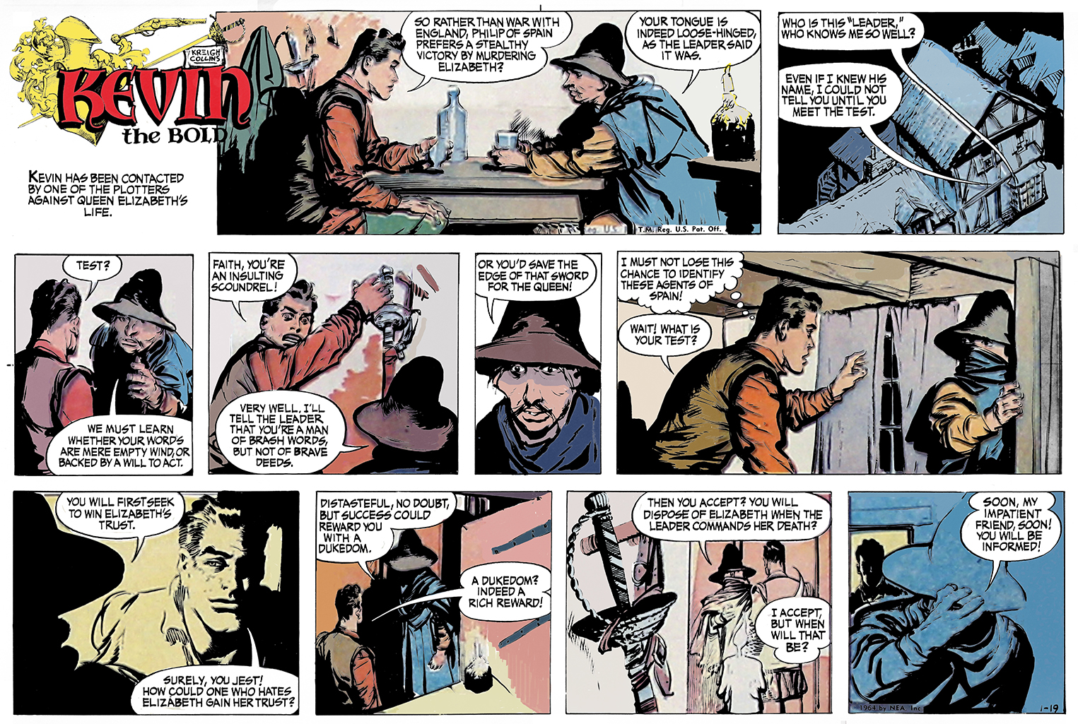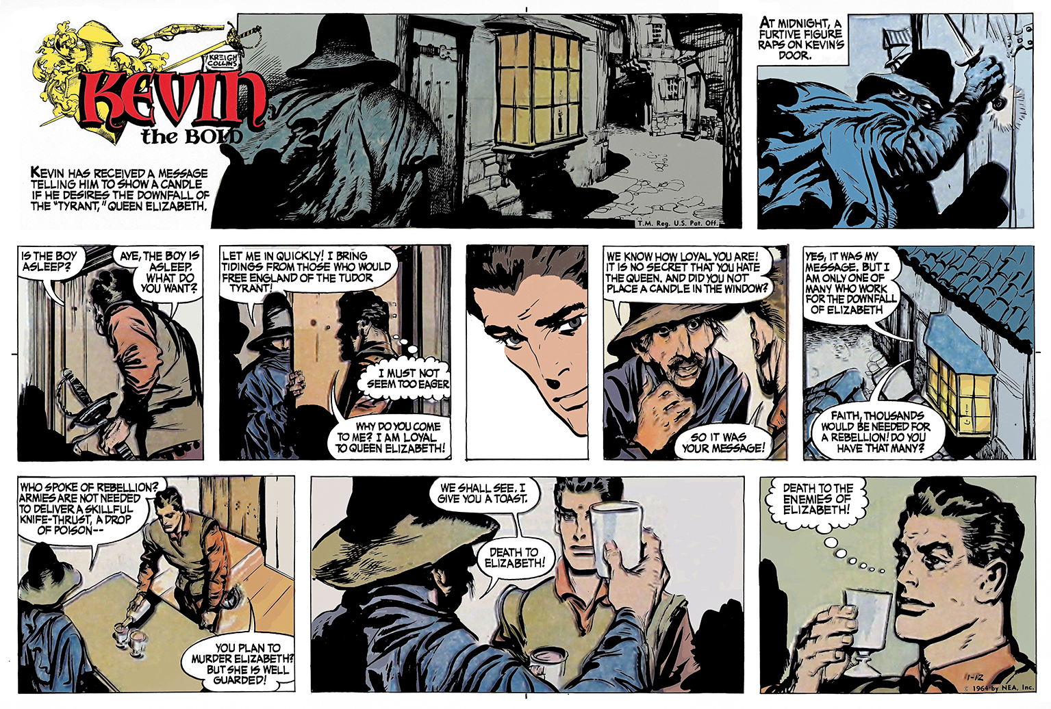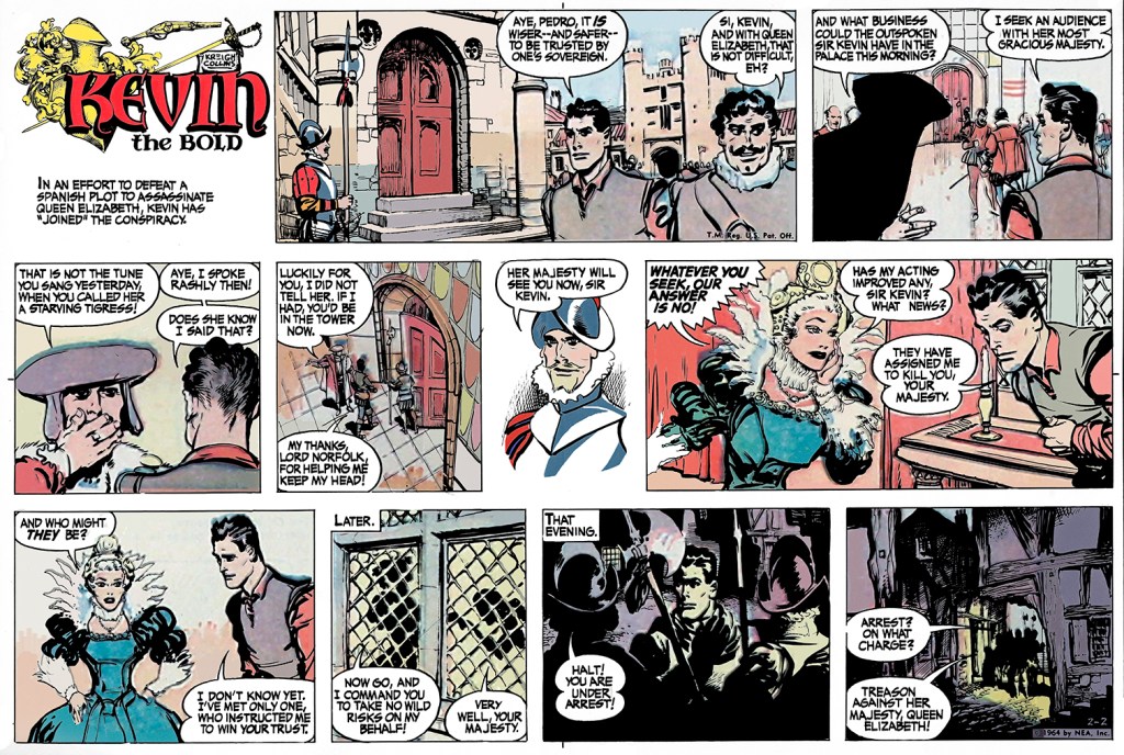 I offer a sincere thank you—this sequence’s remaining color episodes were all produced by Gregorio. Now, picking up where we left Kevin, he has just agreed to infiltrate a gang of conspirators plotting against Queen Elizabeth.