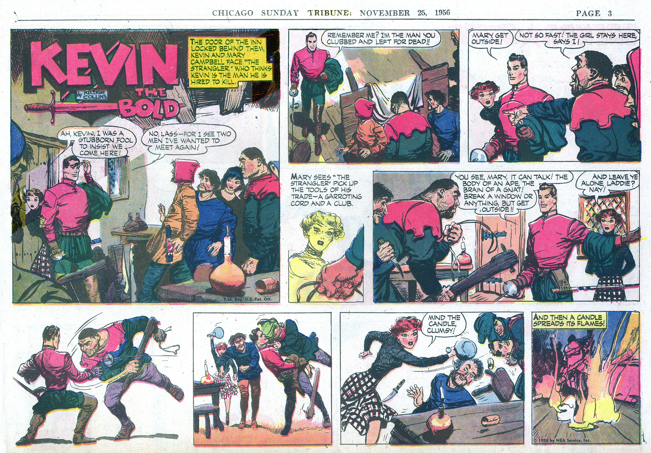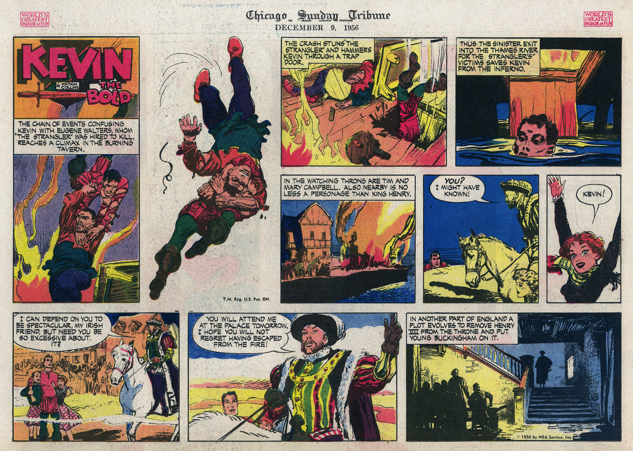 Even a most preliminary investigation of KEVIN THE BOLD reveals that he spent time as an Irish agent of King Henry VIII—indeed, in early 1956 the English king became a featured character and appeared regularly. But as the years passed, Henry aged out and was eventually succeeded by Queen Elizabeth I. She first appeared in the December 22, 1963 episode of Kreigh Collins’ feature.