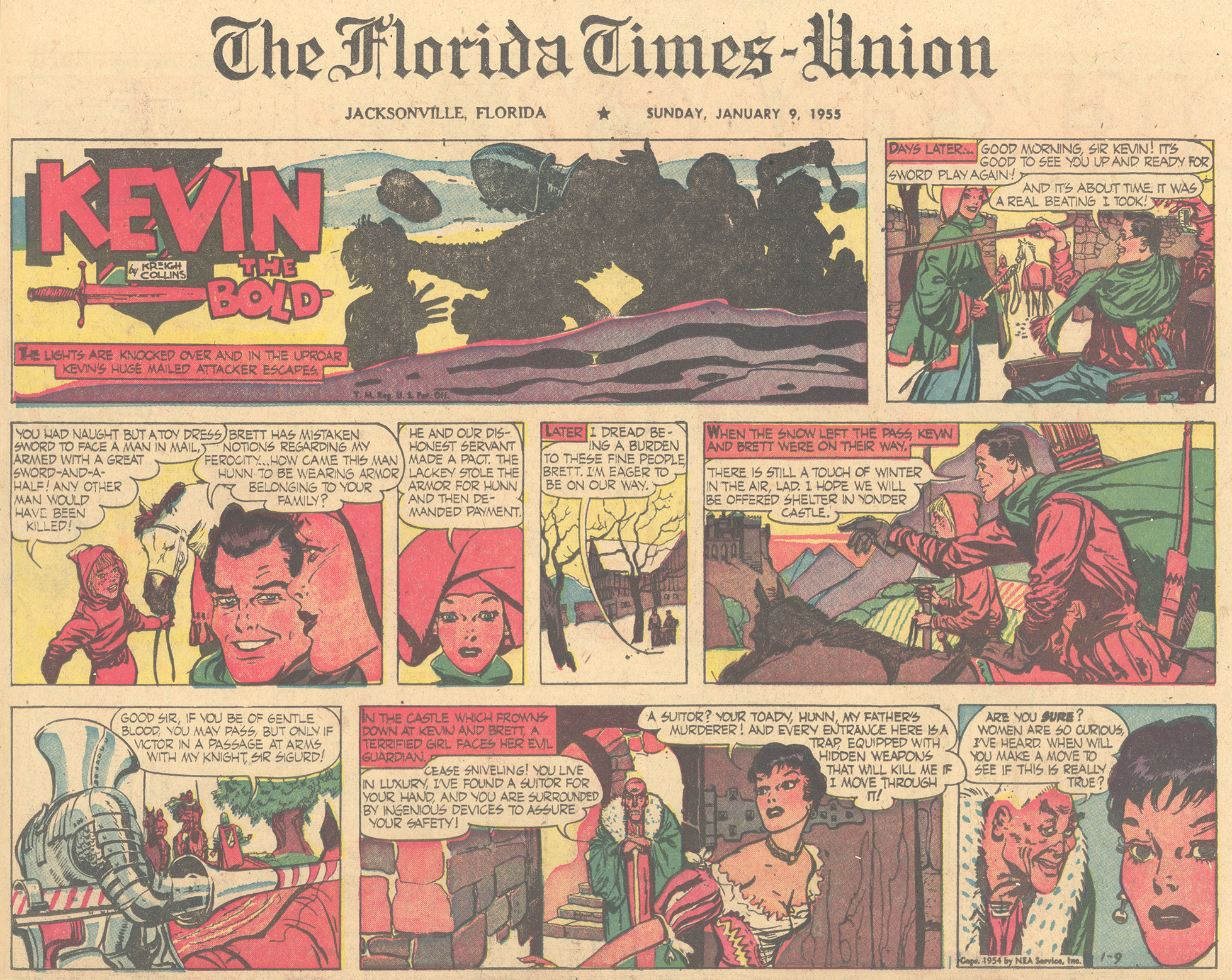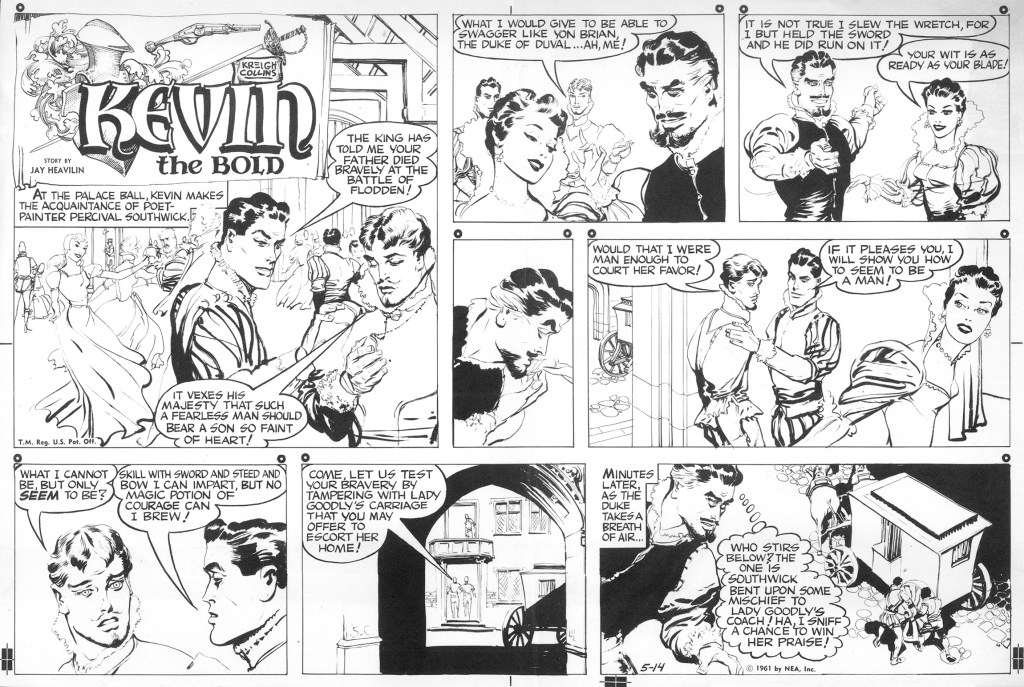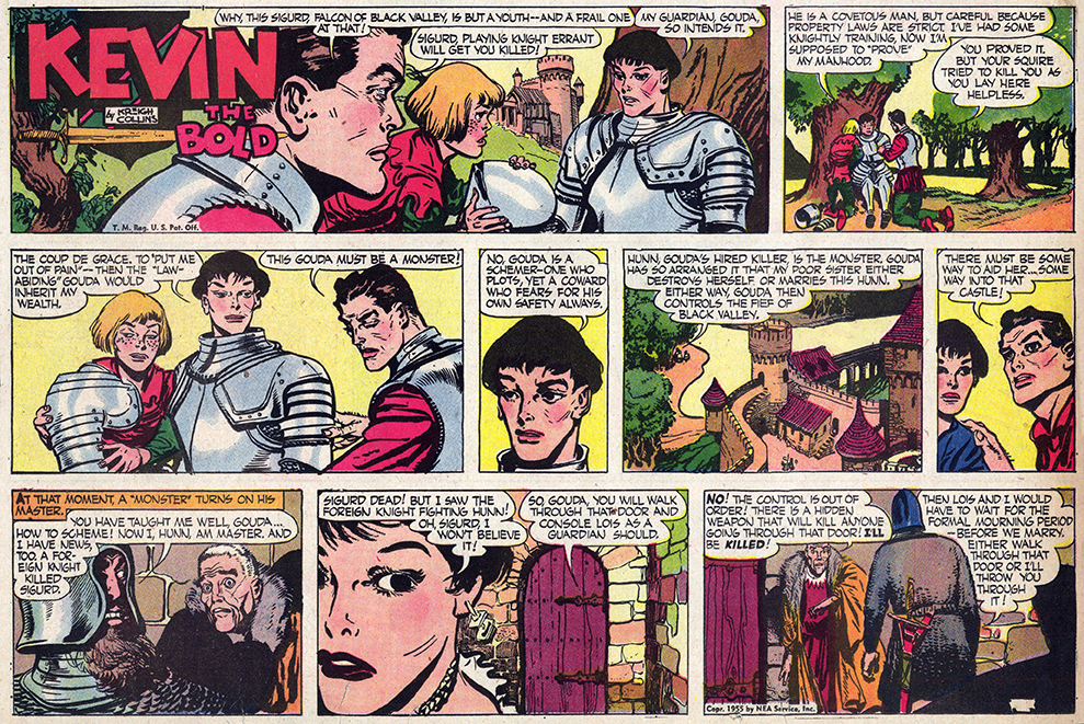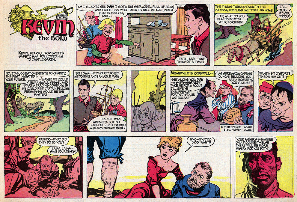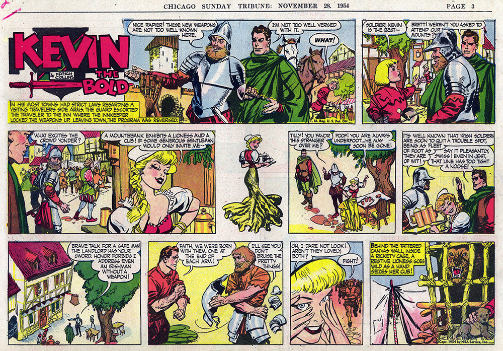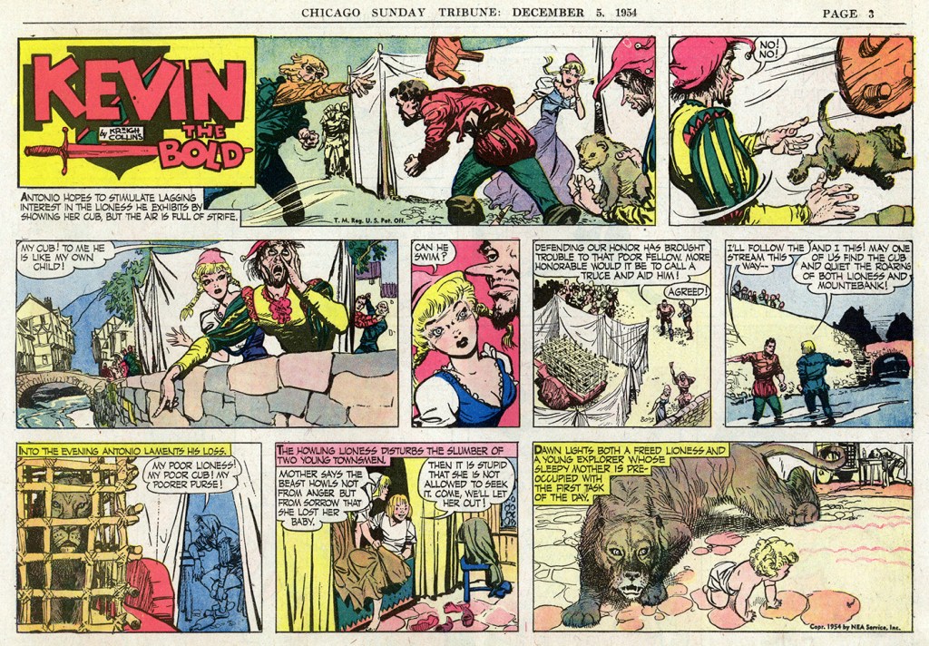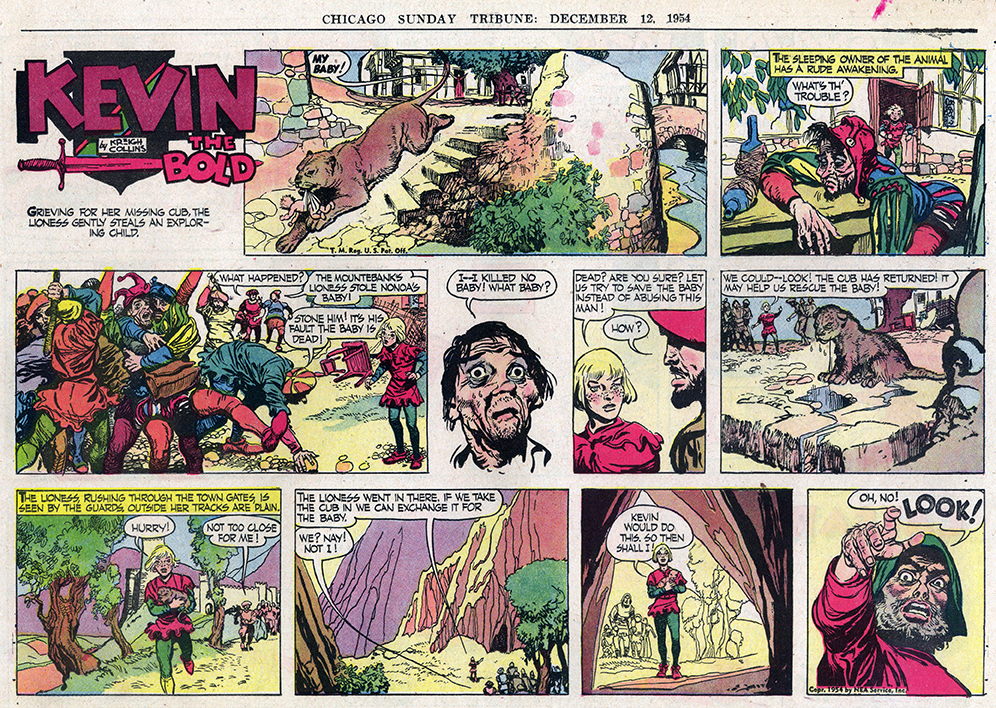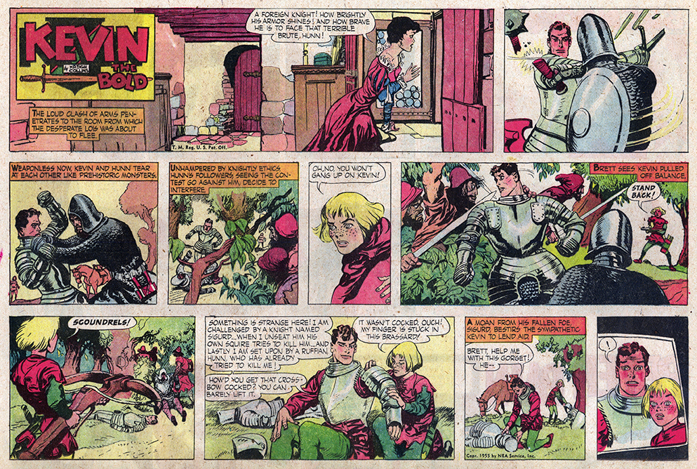 A copyright line inside indicates it was published in 1974, which means it came out at about the same time the Menomonee Falls Gazette also began reprinting “Kevin the Bold.” (A small amount of material overlaps the two publications’ efforts). The 66 individual comics it features make up five complete story arcs—all of the 1954 “Kevin the Bold” Sunday comics plus another 15 from 1955. The first story, “The Island of Death,” appears below.