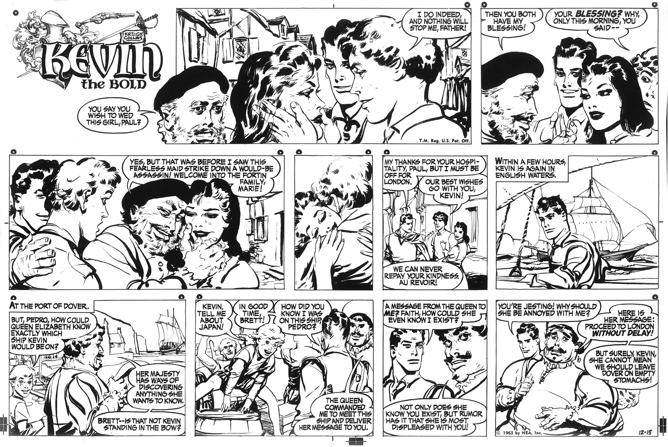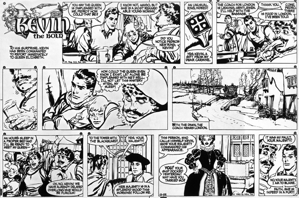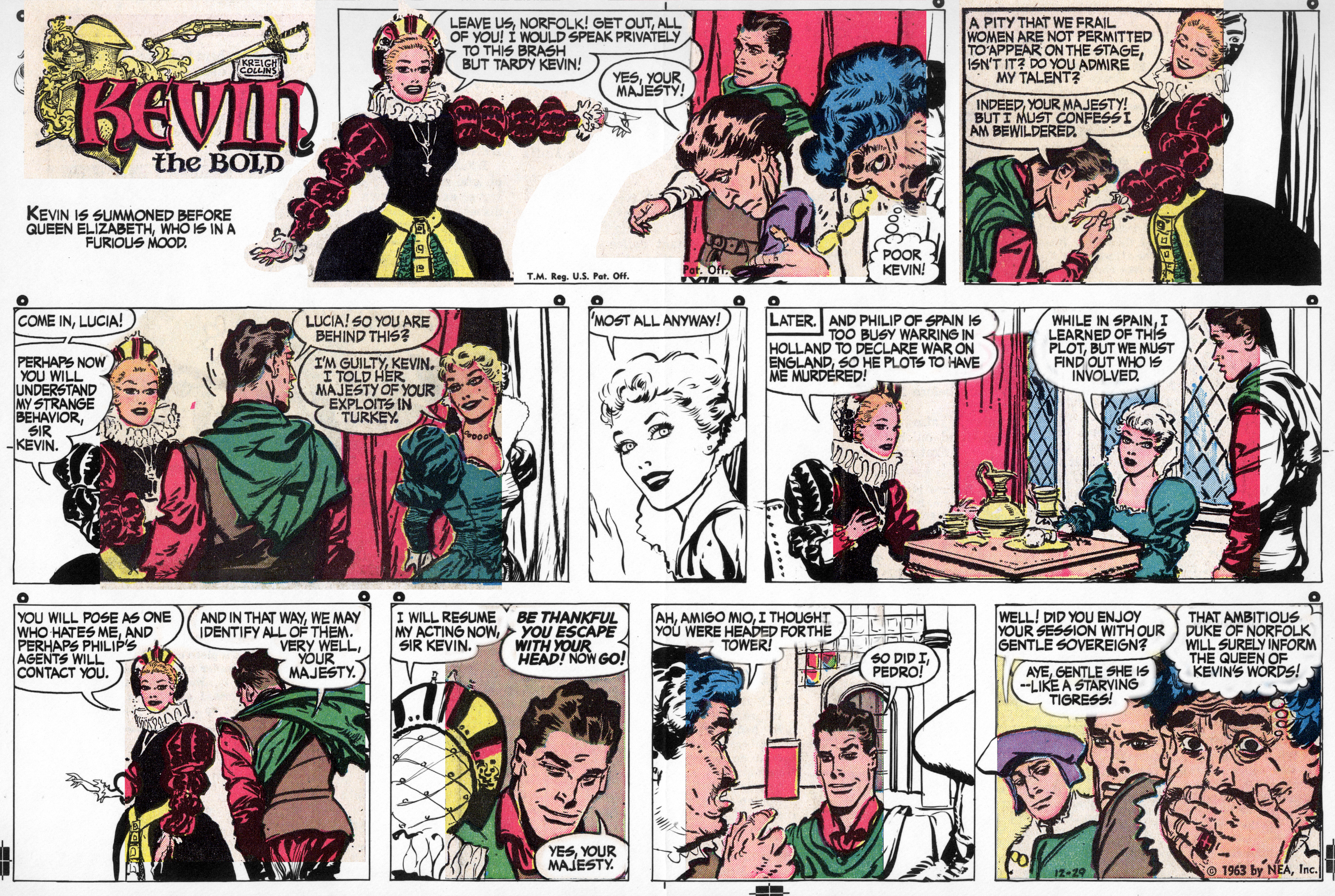 Even a most preliminary investigation of KEVIN THE BOLD reveals that he spent time as an Irish agent of King Henry VIII—indeed, in early 1956 the English king became a featured character and appeared regularly. But as the years passed, Henry aged out and was eventually succeeded by Queen Elizabeth I. She first appeared in the December 22, 1963 episode of Kreigh Collins’ feature.