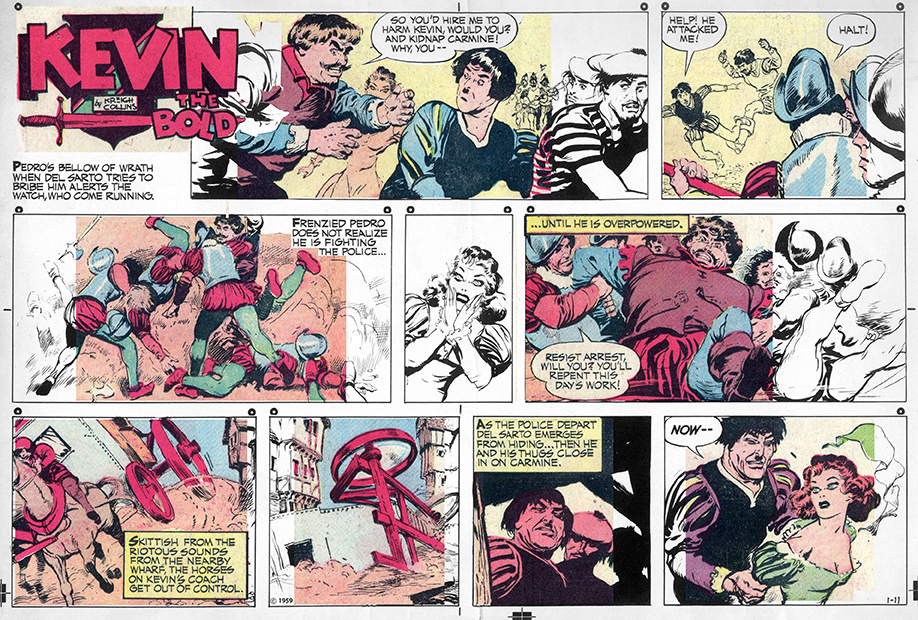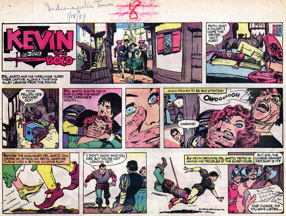 MITZI McCOY ran from 1948 to 1950 and showcased Kreigh Collins’ skill as an illustrator and storyteller. His picturesque landscapes, lovely character designs, and thrilling action sequences brimmed with detail and charm, and the strip’s ensemble cast rotated in and out of the spotlight taking turns as protagonists in the dozen story arcs collected in this volume. The last story collected in “The Complete Mitzi McCoy” is the narrative bridge that set Collins and his characters off on a new journey, beautifully told for the next couple of decades in the much-lauded adventure strip Kevin the Bold.