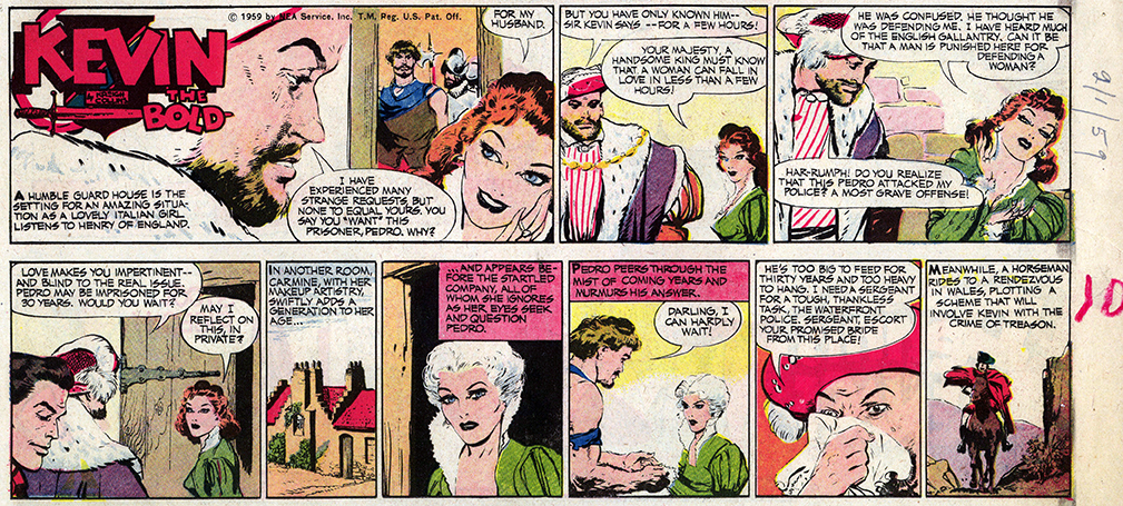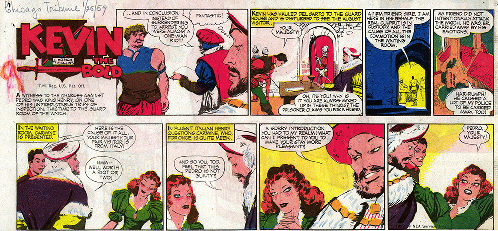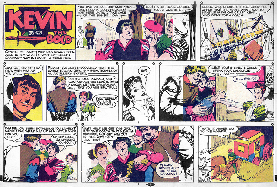 Unfortunately, my third page episode for July 24 was torn and taped together, discoloring the page in a couple spots. And perhaps the third pages mesh better with black and white half pages better than with black and white bromides. Meanwhile, in the episode above, what Brett had done to sabotage the Falcon wasn’t exactly clear. Quick checks on the definitions of top hamper and main brace were helpful—Brett cut the line holding the ship’s uppermost rigging in place, causing a mess. (I wonder how many comic strips inspire readers to look up definitions? Some people might find it tedious, but I love the educational aspect of KEVIN THE BOLD).