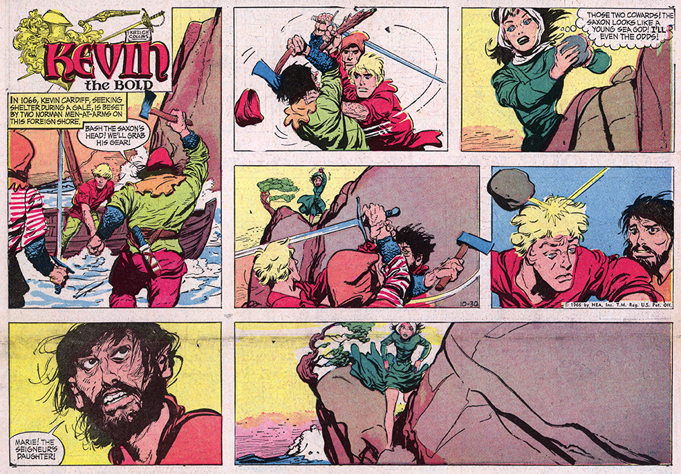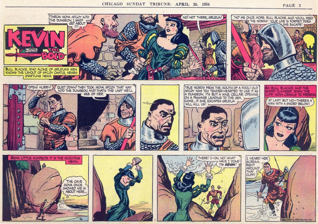MITZI McCOY ran from 1948 to 1950 and showcased Kreigh Collins’ skill as an illustrator and storyteller. His picturesque landscapes, lovely character designs, and thrilling action sequences brimmed with detail and charm, and the strip’s ensemble cast rotated in and out of the spotlight taking turns as protagonists in the dozen story arcs collected in this volume. The last story collected in “The Complete Mitzi McCoy” is the narrative bridge that set Collins and his characters off on a new journey, beautifully told for the next couple of decades in the much-lauded adventure strip Kevin the Bold.