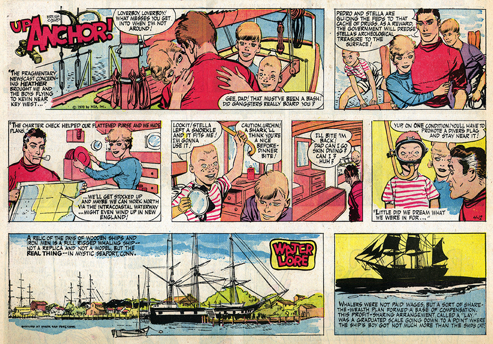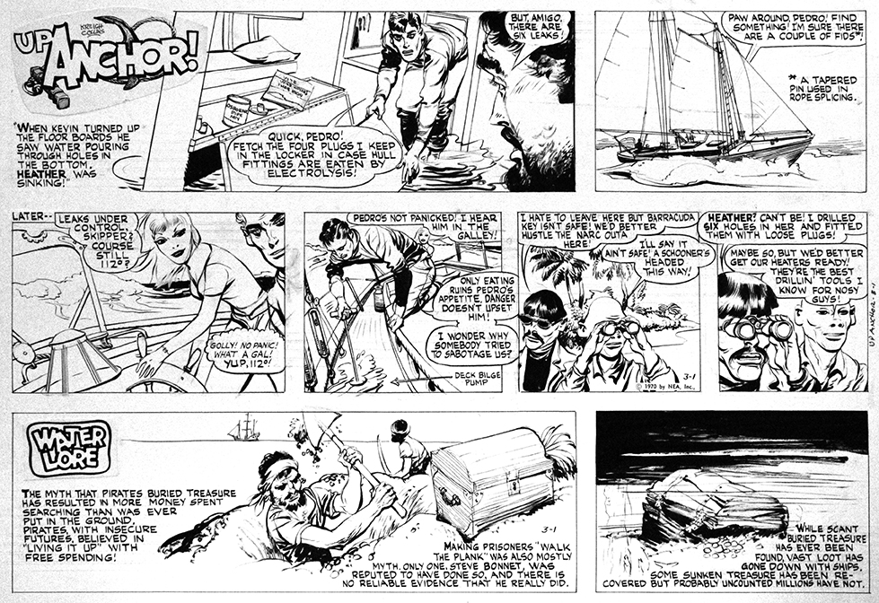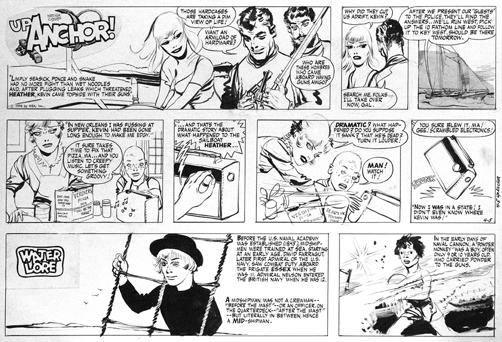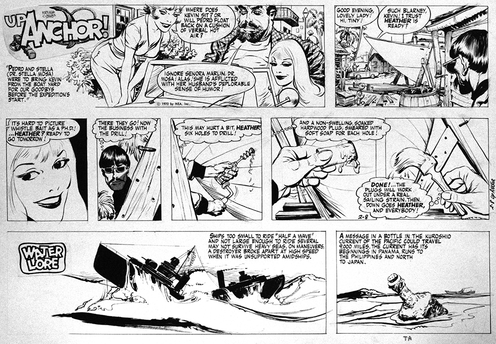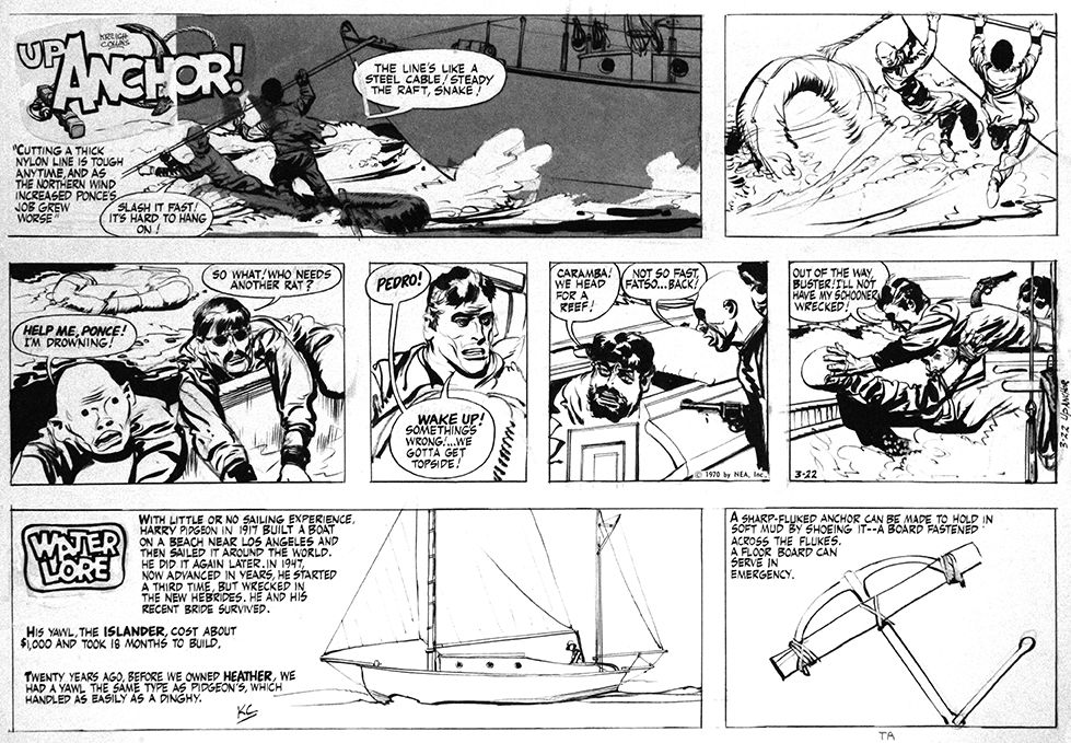 With summer here, it seems appropriate to feature a sequence from Kreigh Collins’ sailing-themed comic strip UP ANCHOR!. In this chapter, Kevin Marlin and his family are making plans for an extended journey south aboard Heather. Of the 19 episodes, only half are in color, but they will be supplemented in the coming weeks with some interesting articles on the real-life events that inspired the action in UP ANCHOR!.